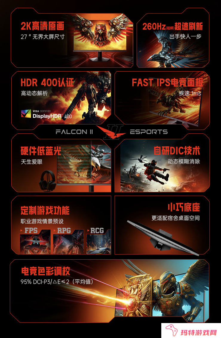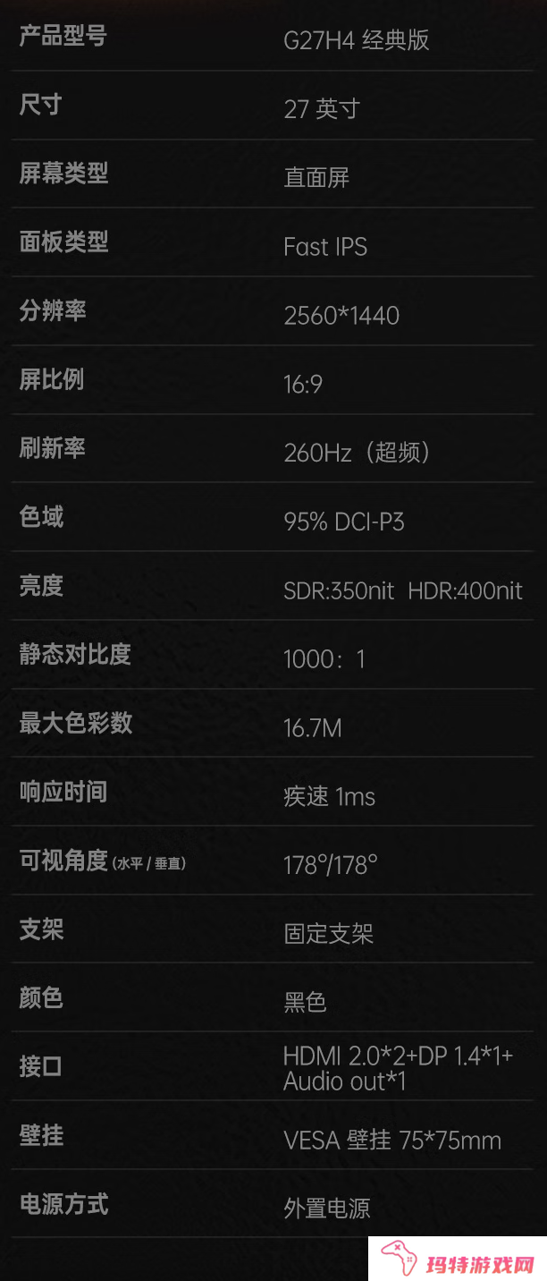 这款显示器配备2560x1440分辨率260Hz(超频,实际为240Hz)Fast IPS面板,典型亮度350尼特,HDR峰值亮度400尼特,静态对比度1000:1,GtG响应速度1ms,支持8-Bit色彩,覆盖95% DCI-P3色域。
